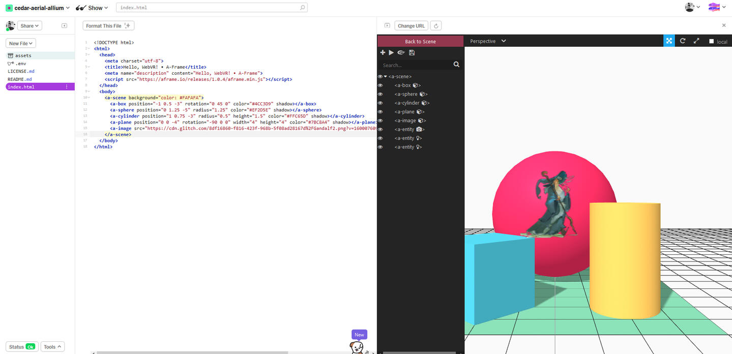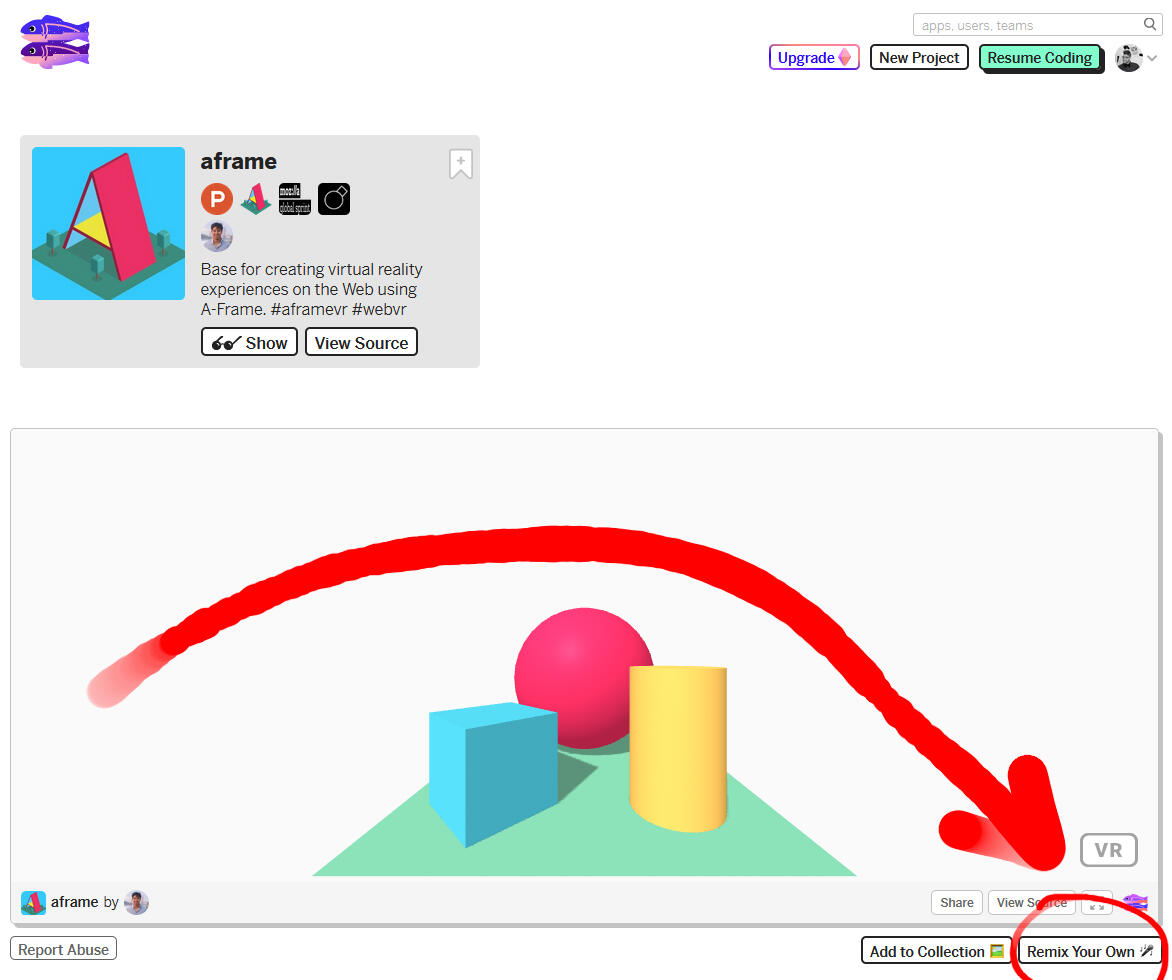 #2.) Remix the "Hello WebVR" project from the A-frame docs.