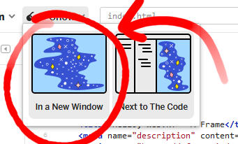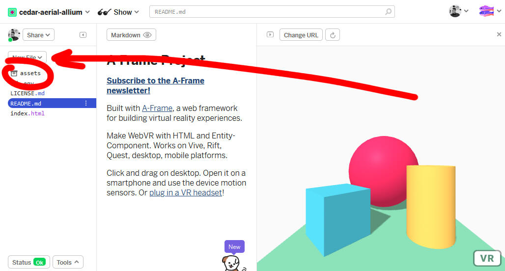 Click the view button in the top left, and hit "In a New Window" to see your creation apart from your code. You can copy and paste that URL, email it, tweet it at @aframevr, or slide it into someone's DM's.And any browser that implements this spec can see it, and pipe it out to whatever HMD you have connected to your PC. You can make VR/AR content, all for free, from the web, using HTML. What a time to be alive, no?
