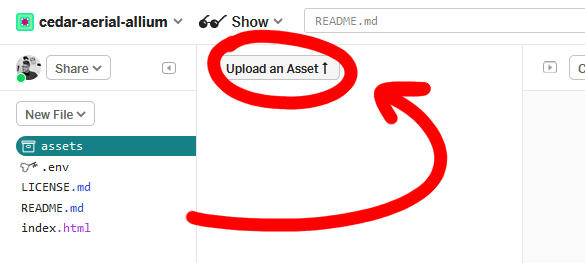 So in the <a-scene> tag you can see all the elements of our scene presently. We have a box, sphere, cylinder, etc. Each one of those has a couple of attributes like its size, shape, color and rotation.All you gotta do is go to the end of </a-plane>, hit return to go to a new line, and copy and paste this image tag into your scene tag. In your image tag, you will replace my fake image name, with the URL to your image that we copied from assets.