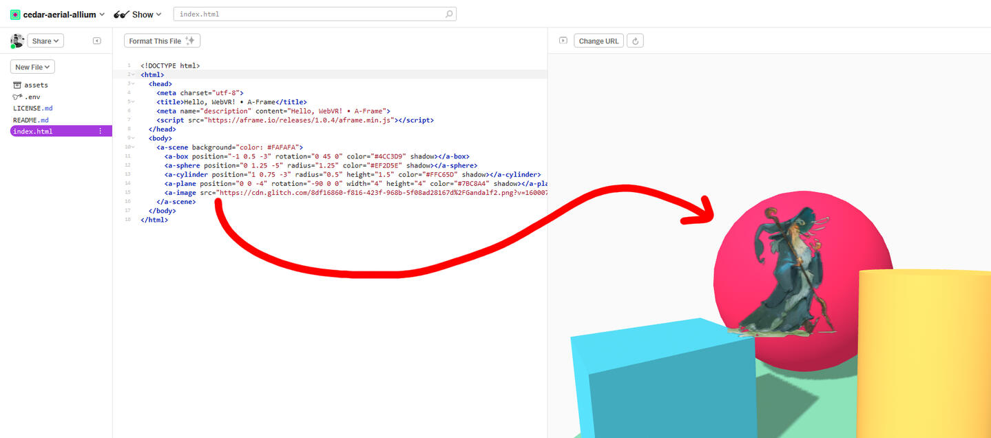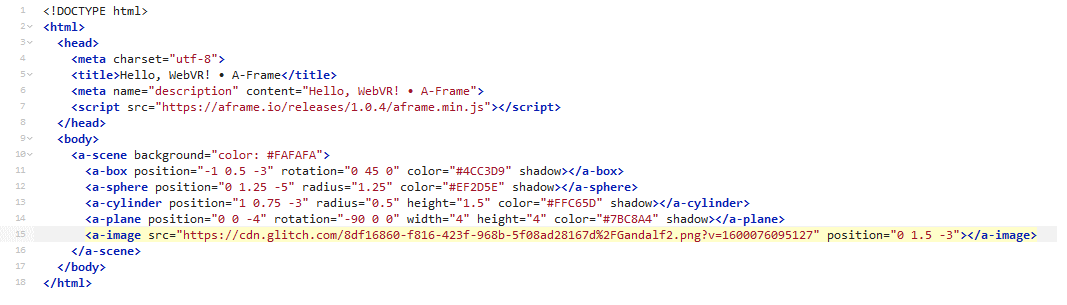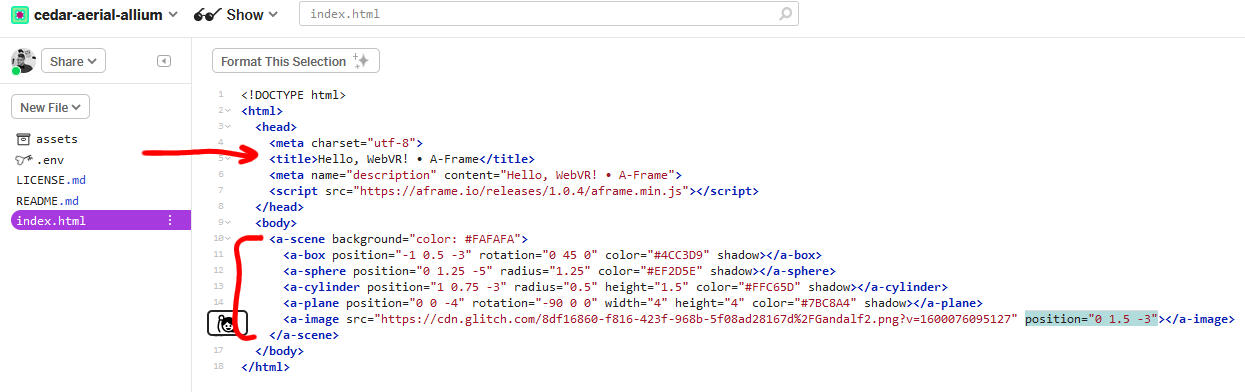 We are gonna put your image in this 3D scene but first you need to understand what we are doing. This is the scariest part of the tutorial. Don't worry, it's short.So HTML tags have an opening and a closing "tag," or characters in between some < and > signs. That's why the page begins and ends with <html> and ends with </html>. So everything in between <head> and </head> is establishing details about our site. What shows up as the title of our page and also what fonts and scripts we are using. This scene is being built in A-frame, so we have called it to use in the <body> down below.Take the string <title> Hello, WebVR! </title> for example. We have the title opening tag, <title> the content of the title tag, and then the closing title tag. </title>Inside of the opening tags are 'properties' or things that help define the object. For instance in this box tag,