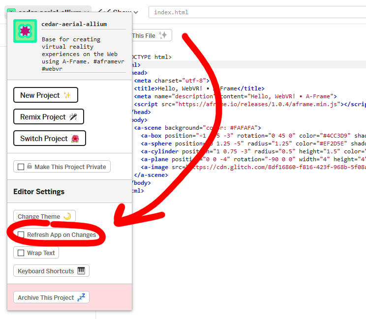 First, we have to stop the preview from refreshing automatically. Click on your project title in the top left, and uncheck "Refresh App on Changes."