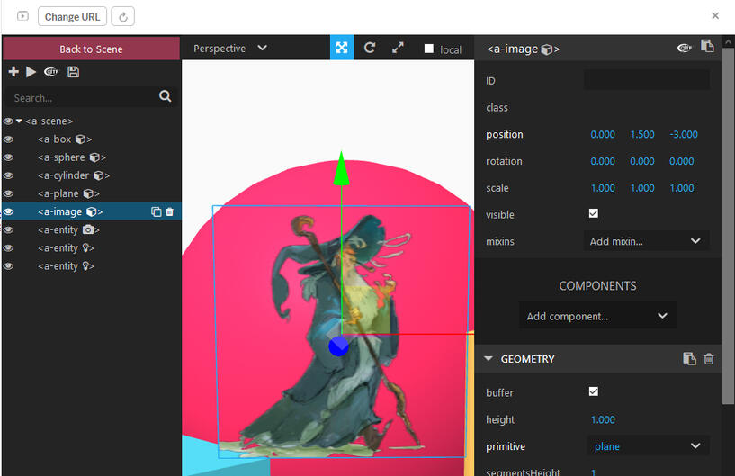 Woah! Who's this dark, sultry UI that just showed up? This is the A-Frame inspector, and it can show and manipulate the attributes of objects in your scene. If you click on your image, either in the scene, or its name on the left, you can view all of its elements and attributes on the right.