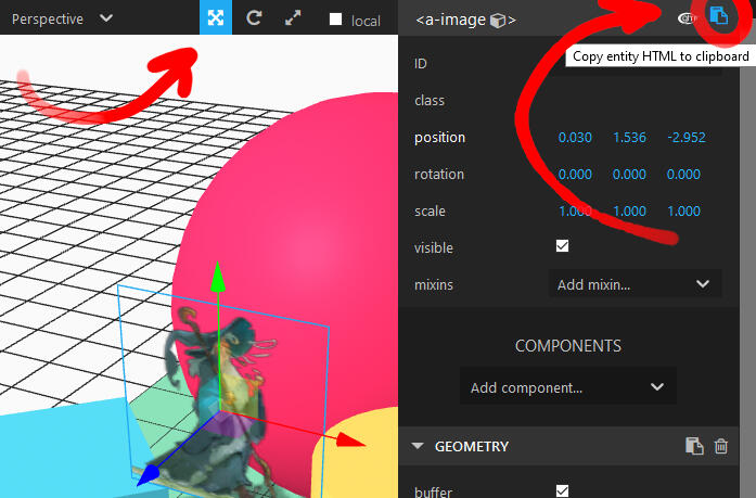 Click and drag on different handles to move it around your scene. With the three arrow-centric buttons at the top right-hand corner of that frame, you can change how clicking and dragging a handle affects your object. Over on the right-hand side, you can manually set values for a whole slew of different attributes. Once you are happy with your object, hit the button in the very upper right to copy that object.If you are having transparency issues, try setting the AlphaTest attribute to 0.5